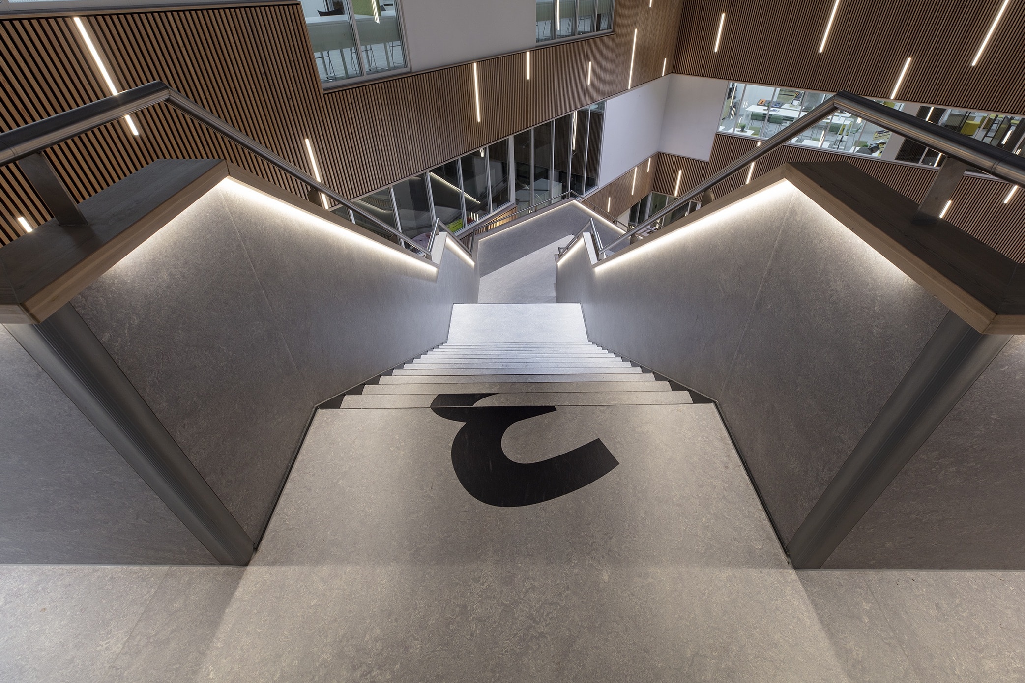 Een bijzonder onderdeel van dit project zijn de opvallende trappen en bordessen die dwars door het gebouw lopen en verschillende verdiepingen met elkaar verbinden. Deze stalen trappen vormen een architectonisch element binnen het gebouw en zijn zorgvuldig voorbereid en afgewerkt zodat ze naadloos aansluiten op de vloerafwerkingen. De traptreden en bordessen zijn voorzien van een duurzame bekleding die zorgt voor een veilige, slijtvaste en visueel rustige uitstraling binnen het interieur.