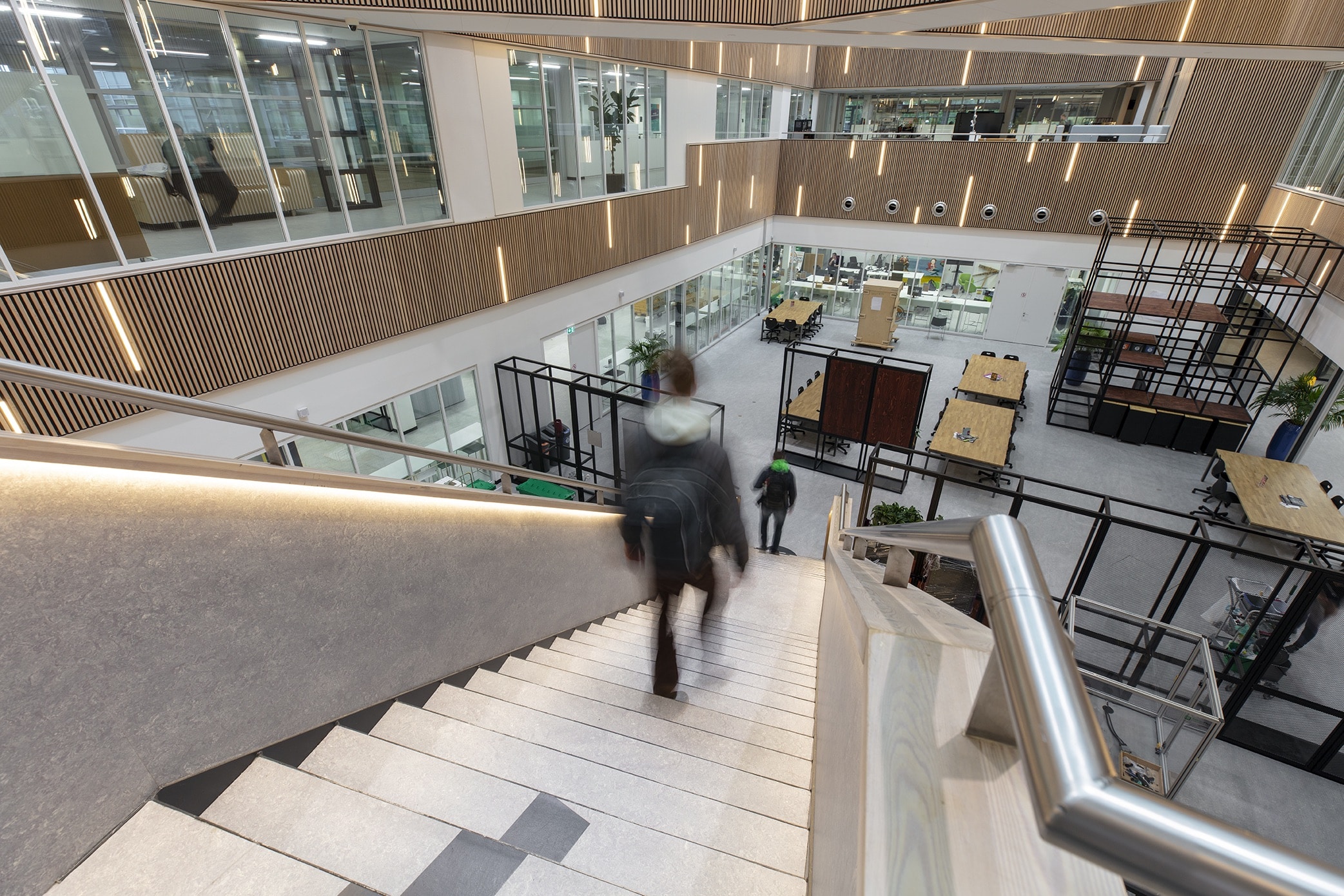 - Opvallende trappen en bordessen die als architectonisch element door het gebouw lopen