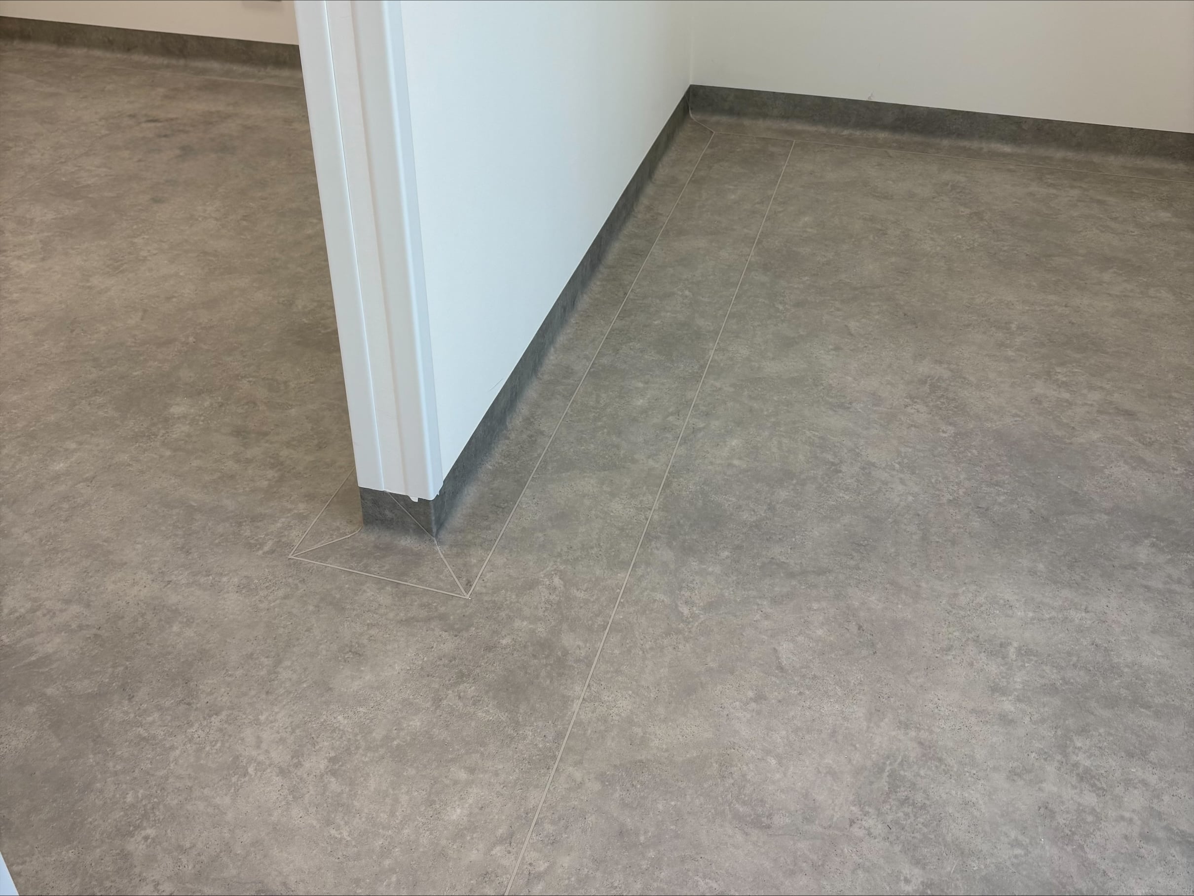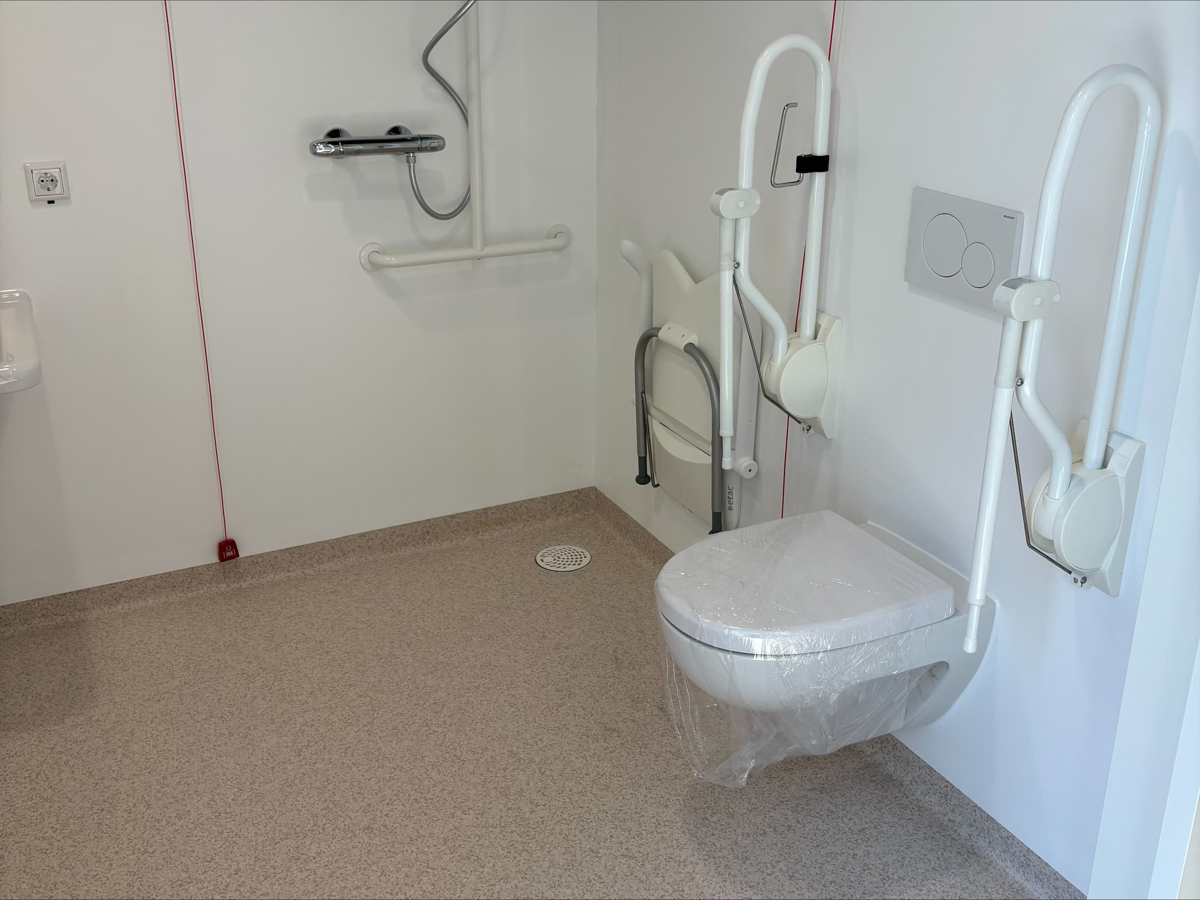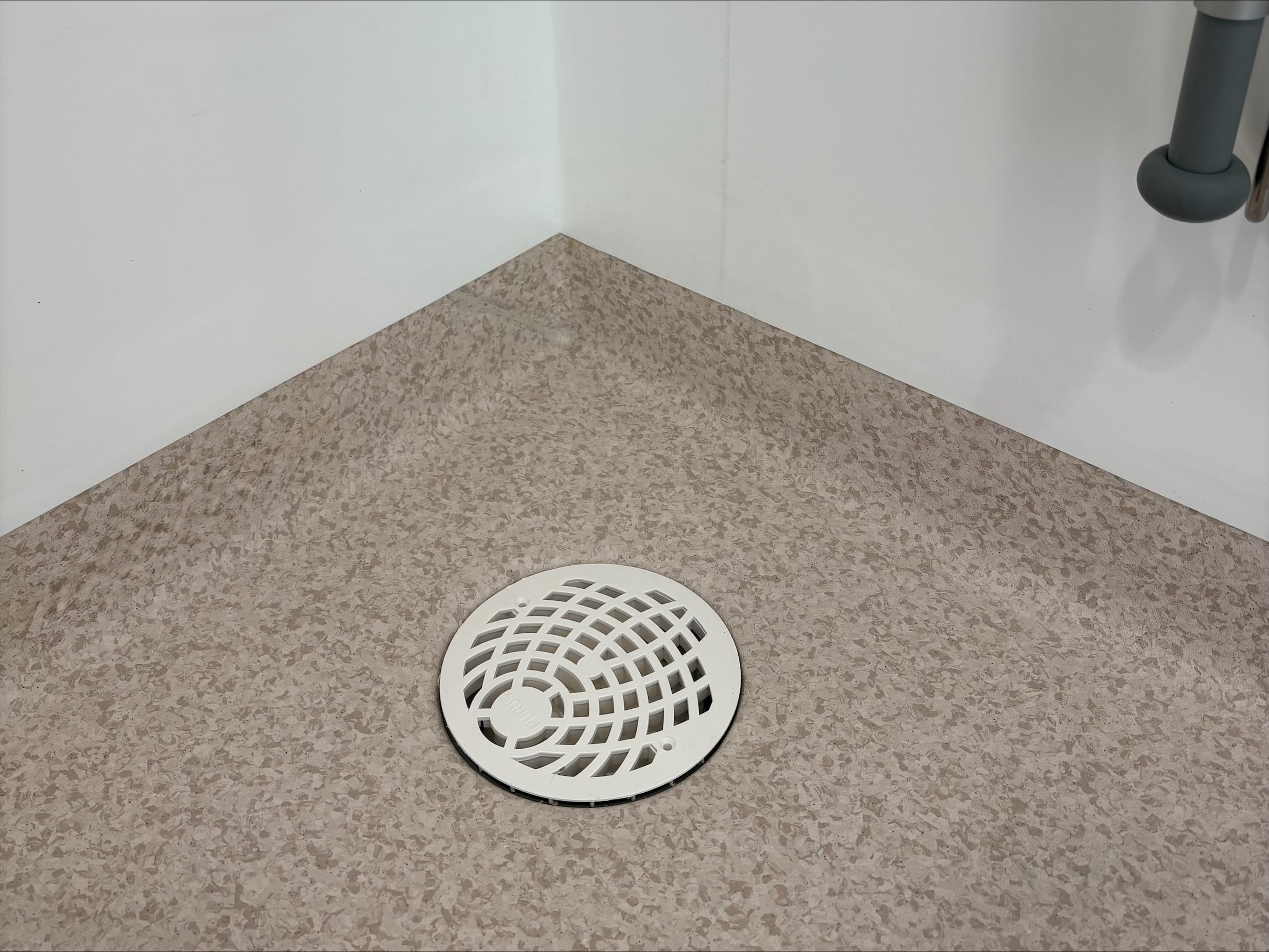 Een bijzonder onderdeel van dit project zijn de sanitaire ruimtes. Hier is gekozen voor een volledig geïntegreerd systeem waarbij de PVC vloer naadloos overgaat in de wandafwerking door middel van holle plinten. Dit zorgt voor een 100% waterdichte en hygiënische badkameroplossing, zonder naden waar vuil of vocht zich kan ophopen.